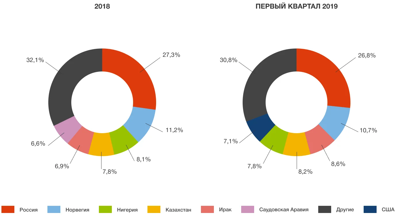Позиции России в импорте нефти в европейские страны также довольно прочны. Она существенно опережает второго по величине поставщика — Норвегию. За ними следуют Ирак, Казахстан, Нигерия и США. Доля первой шестерки выросла с 67,9 % в 2018 г. до 69,2 % в 2019 г.