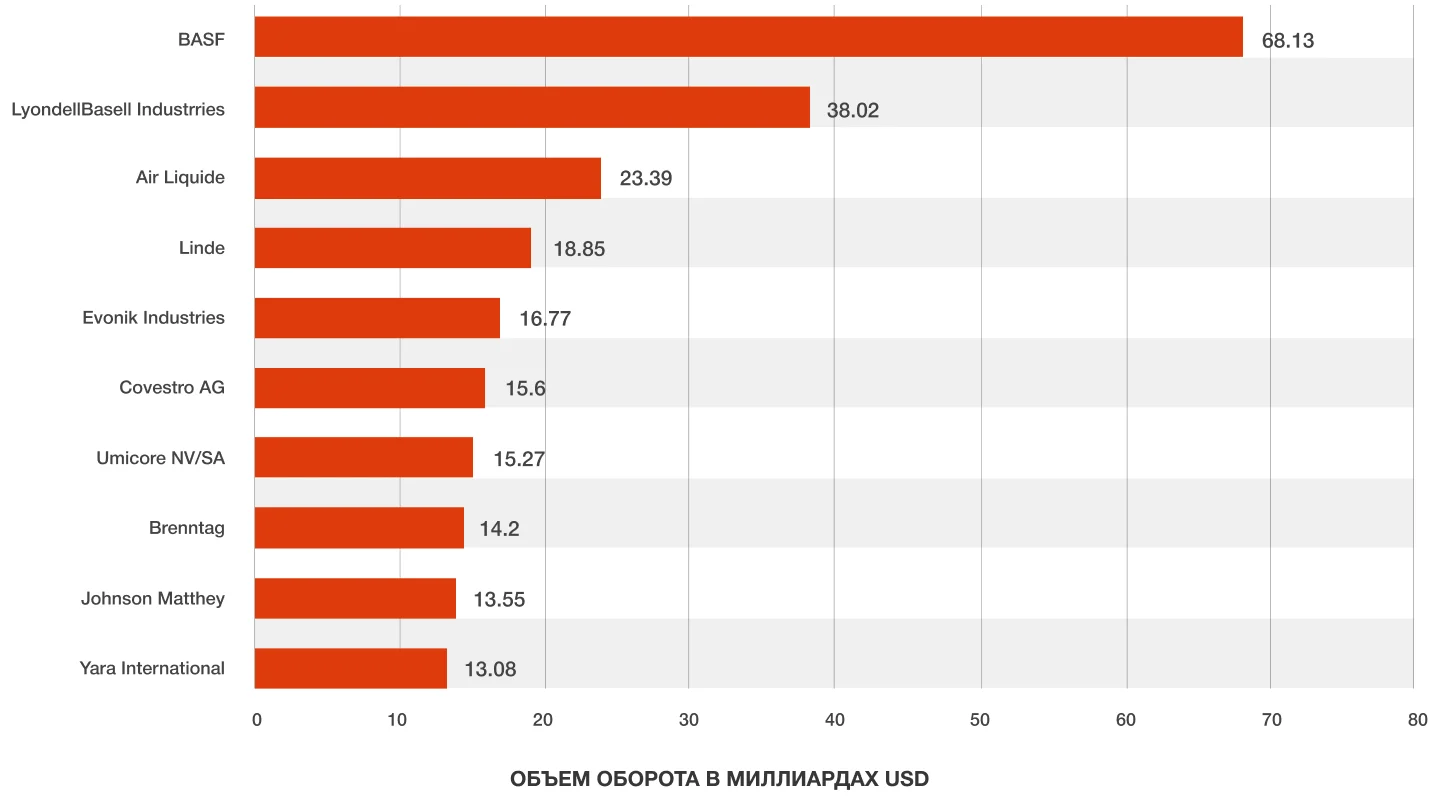 Согласно данным статистики за 2019 год, ведущей химической компанией в Европе по выручке является BASF. В прошлом году выручка немецкого концерна составила около 68 млрд USD. Ниже представлен рейтинг ведущих химических компаний Европы по выручке.