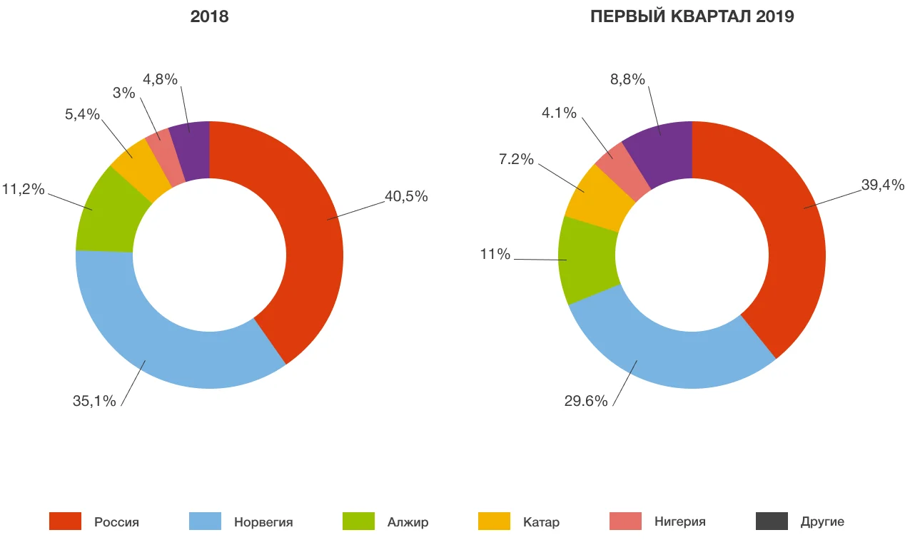 Что касается природного газа, то Россия остается его крупнейшим поставщиком для ЕС. Другим ключевым партнером, имеющим значительную долю в общем объеме импорта, является Норвегия. Дополнительные поставщики — Алжир, Катар и Нигерия. Доля всех других стран, экспортирующих природный газ в ЕС, составила 4,8 % в 2018 г. и 8,8 % в 2019 г.