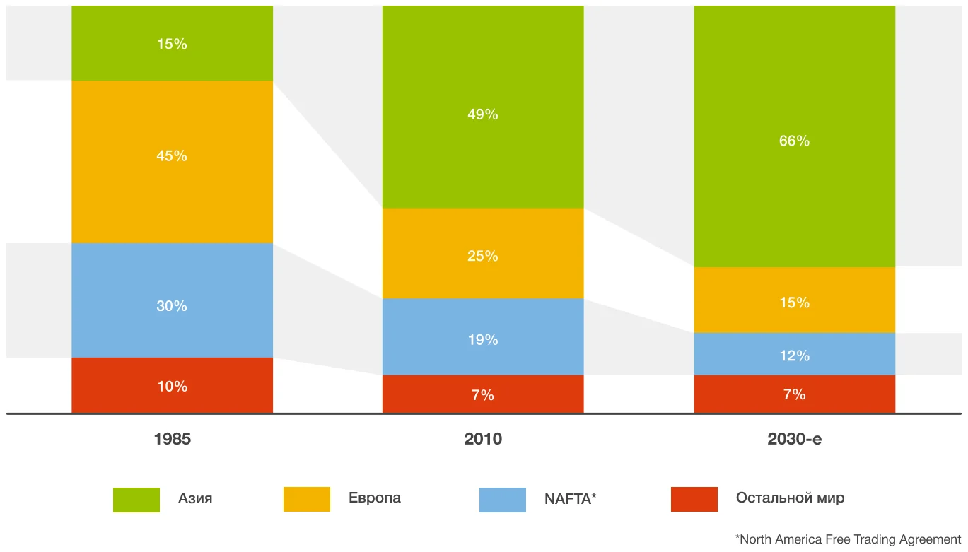 Ключевой тенденцией в мировой экономике является азиатский рост, который стимулируется все более быстрой интеграцией региональных экономик по всему миру. Изменение направления торговых потоков между Азиатско-Тихоокеанским регионом и Европой будет способствовать доминированию восточных игроков.