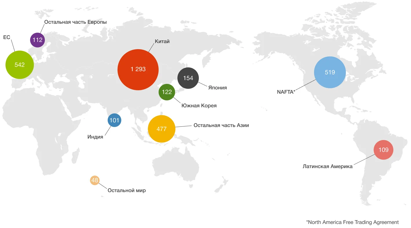 Объемы продаж химической продукции в мире в 2018 году. Источник: доклад Европейского совета химической промышленности «Ландшафт европейской химической промышленности — 2018».