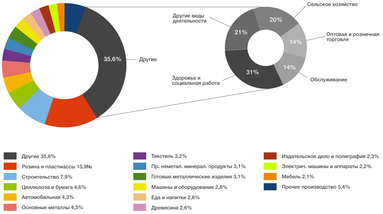 Химическая промышленность ЕС по секторам. Источник: доклад Главного управления предпринимательства и промышленности Европейской комиссии «Состояние европейской химической промышленности».